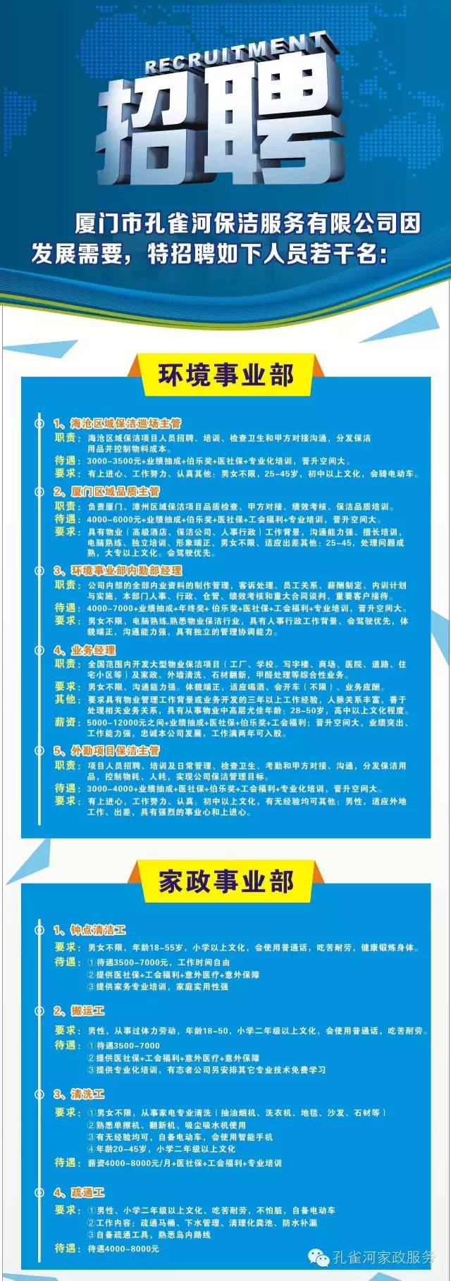因公司規(guī)模不斷的擴(kuò)大,業(yè)務(wù)不斷的增多,現(xiàn)廈門孔雀河保潔服務(wù)有限公司向社會有志之士招收一批人才。廈門孔雀和重金招聘